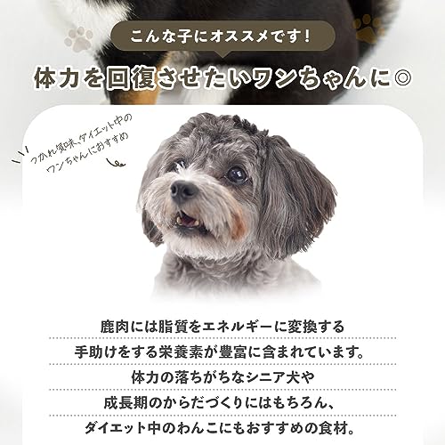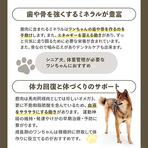 このおやつは国産素材のみを使用し、製造過程で添加物を一切用いないため、愛犬の健康を第一に考えた商品です。ただし、鹿肉はアレルギーを起こす場合もあるため、初めて与える際は少量から様子を見てください。また硬さがあるため、歯が弱い犬や老犬には注意が必要です。