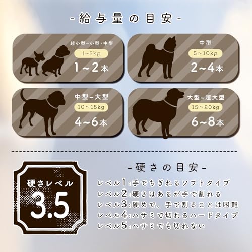 小型犬から大型犬まで幅広く対応可能な噛みごたえがありますが、特にトイ・プードルやチワワといった小型犬からゴールデン・レトリーバーやラブラドールなどの大型犬まで対応実績があります。与える際は愛犬の噛む力や体格に応じて適量を調整してください。