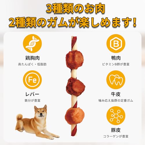 噛み応えのある牛皮ガム特有の弾力があるため、生後6ヶ月以上の健康な成犬に適しています。幼犬や歯の弱い老犬には硬すぎる場合があるため、状況に応じて与え方を調整してください。特に中型~大型犬の噛む嗜好が強い犬種にマッチしやすい製品です。