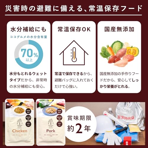 ココグルメは獣医師監修のもと、新鮮な国産食材を使用し、栄養バランスと安全性を追求した総合栄養食として、愛犬の健康を力強くサポートします。化学添加物を排除し、グレインフリーにこだわることでアレルギーが心配な犬にも優しく、常温保存が可能なレトルト仕様は災害時や備蓄にも最適です。