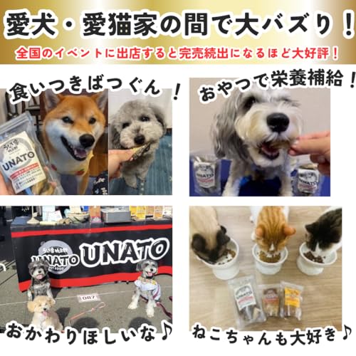 UNATOは国産うなぎの頭を原材料とし、無添加・無塩・グレインフリー製法にこだわっています。合成保存料や香料は使っておらず、骨まで食べられるサクサク食感で、アレルギーリスクも低減。愛犬・愛猫の健康に配慮しつつ、安心して与えられる点が信頼されています。