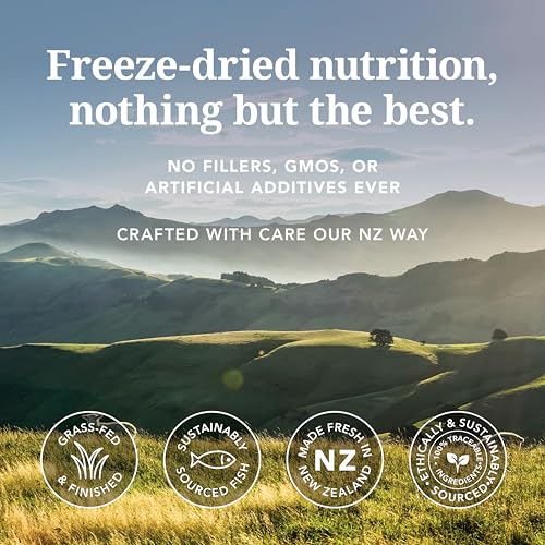 肉類94%以上、穀類不使用でアレルギーリスクを抑えたフリーズドライフードです。特に関節や目の健康を気遣うシニア犬や消化の弱い犬におすすめですが、子犬にも適しています。原材料はニュージーランド産で品質管理が徹底されており、安心して与えられます。