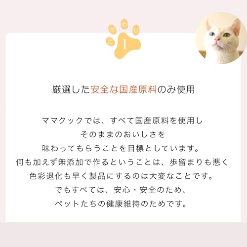ママクックは、安心できる国産素材のみを使用。合成保存料や着色料、香料などの添加物を一切含まないため、敏感な体質の犬や食物アレルギーを抱える犬にも適しています。これにより長期的な健康維持に寄与し、飼い主の信頼を得ています。