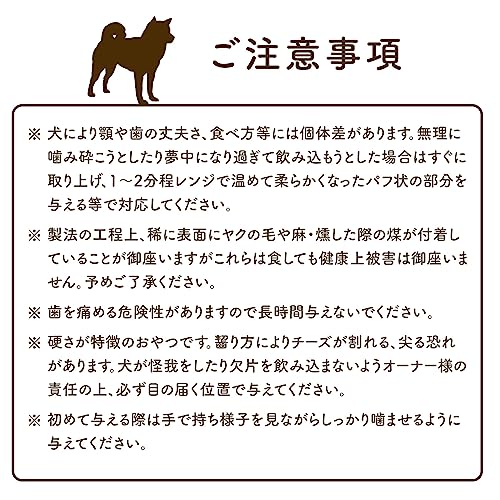 完全手作りの自然食品である反面、硬さが特徴的なため長時間の与えすぎや、犬の歯の状態に注意が必要です。必ず目の届く範囲で10~15分程度に制限して与え、初めての際は様子を見ながら噛ませることが推奨されます。稀に表面にヤクの毛や燻した際の煤が付着することがありますが、健康に影響はありませんので安心してください。