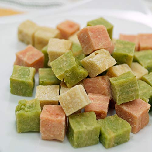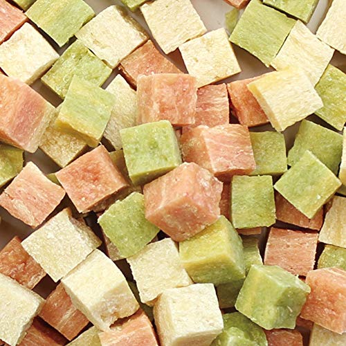 - 小粒の約1cm四方のダイスサイズはしつけやトレーニングに適していますが、一度に大量に与えるとカロリーオーバーになる恐れがあるため、適量を守ることが大切です。
