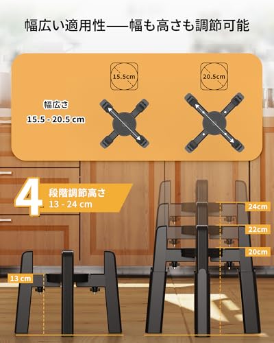 本スタンドは耐久性のあるABS素材で作られており、丈夫かつ軽量。ネジ固定式のため高さ・幅調整後もぐらつきが少なく安定しています。また、付属のステンレスボウルは衛生面で優れており、食器洗い機にも対応。さらに滑り止めマット装着で使用中の転倒リスクも抑制されています。工具不要の簡単組み立ても大きな魅力です。