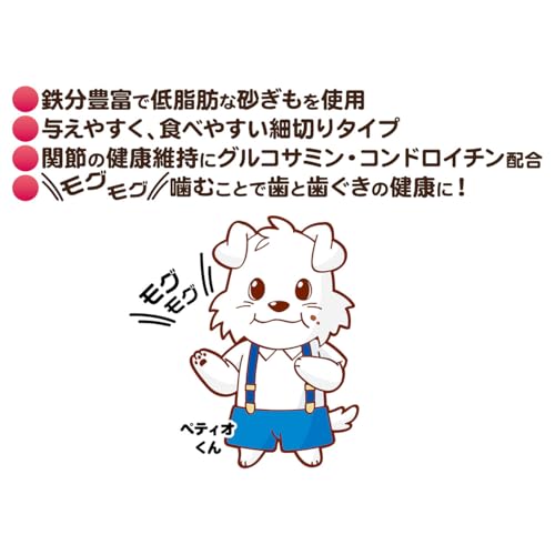 ペティオ チキンガムMOGU無添加 7歳からのやわらか砂ぎも細切りは、シニア犬向けに開発された商品です。特に7歳以上の中高齢犬に配慮しており、やわらかい細切り形状で噛む力が弱くなった犬でも食べやすく設計されています。また、グルコサミンやコンドロイチンを配合しているため、関節の健康維持をサポートしたい飼い主に適しています。