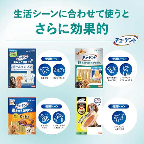 噛む力のある成犬から中型犬に特に適しています。ご褒美チキン風味なので食いつきも良く、歯みがきが苦手なワンちゃんでも楽しく続けやすい特徴があります。ただし、小型犬や顎の弱い犬にはサイズや硬さが合わない場合があるため、飼い主様の判断が必要です。