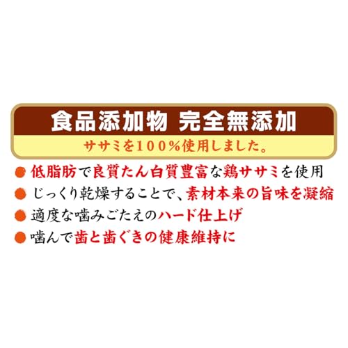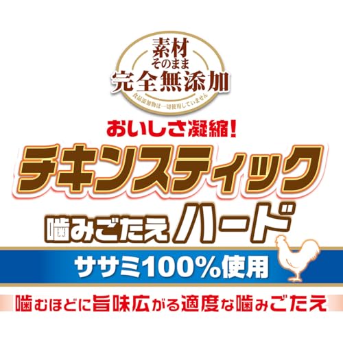 この商品の最大の安心ポイントは、食品添加物を一切使用していない点です。市販の犬用おやつには香料や保存料が使われることも多い中で、ペティオの完全無添加は、体への負担を極力減らすための配慮が伺えます。また、鶏ササミの自然な旨味を活かす製法によって、噛みごたえも適度で犬の顎を鍛えるには最適です。