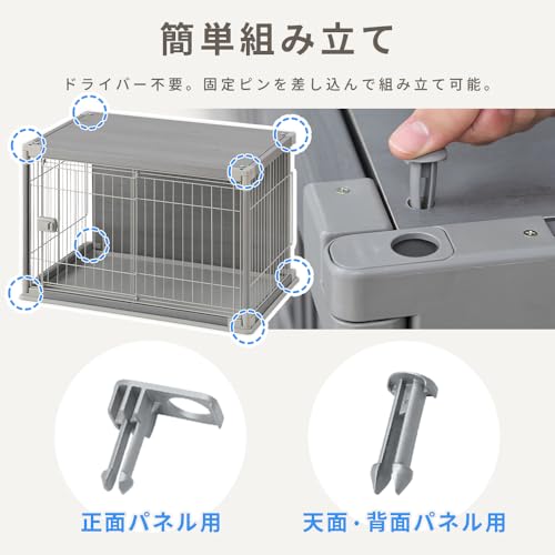 フレームはエポキシ粉体塗装を施したスチール線材を使用し、錆や腐食に強い構造。さらに、扉ロック部分にはABS樹脂を採用し、小型犬の飛び出しを防止しつつ、飼い主が簡単に操作可能です。この堅牢な作りは、活発な超小型犬・小型犬に安心して使用できる点で評価が高いです。