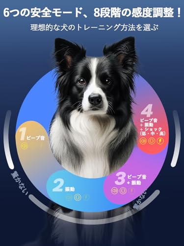 従来製品が使用していたペットに負担がかかる超音波を排除。ビープ音、振動、微電流を組み合わせた4つのモードで、犬の反応に合わせた無理のないトレーニングが可能です。また、8段階の感度調整により小型犬から大型犬まで幅広く対応している点も特徴です。