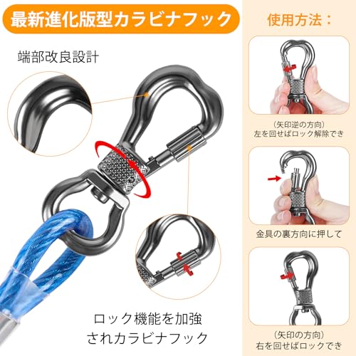 1)ワイヤーを3mの長さで伸ばし、固定ポイントにカラビナフックをかける。2)カラビナのロックを確実に閉じ、360°回転がスムーズか確認。3)犬の首輪に装着後、短時間引張試験(体重の半分程度を想定)を行い、外れや緩みがないか確認します。