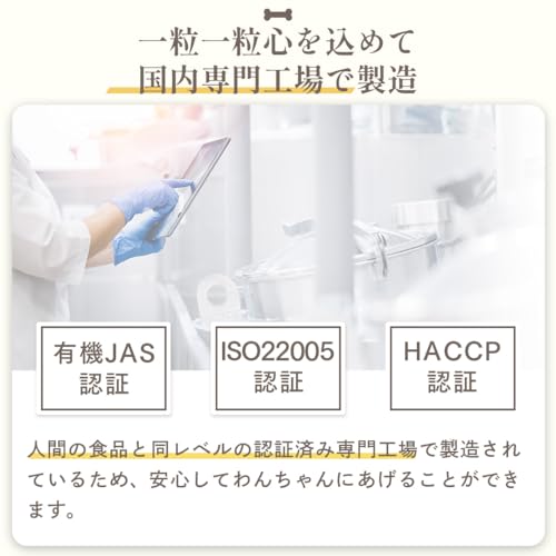 本商品は合成保存料・調味料・着色料・香料・防腐剤を一切使用していないことから、添加物に敏感な愛犬にも安心できる配慮がなされています。さらに、国内の厳格な品質管理基準であるHACCP認証及び食品安全の追跡管理が可能なISO22005認証を取得した工場で製造されており、ヒューマングレードの品質を保っています。安全性を重視する飼い主様にも支持されています。